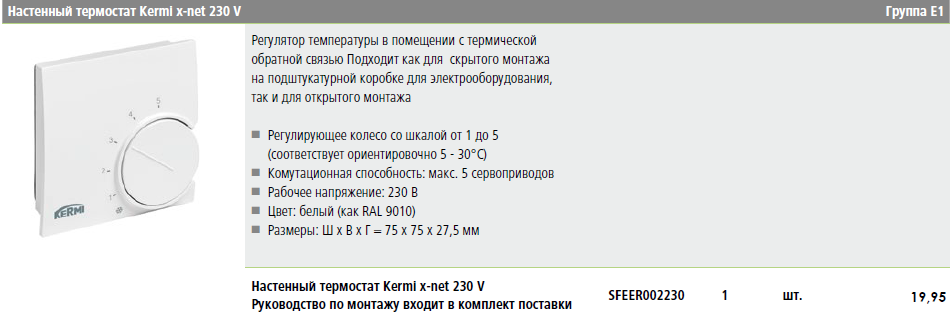 Комнатный термостат Kermi SFEER002230, 230В с термической обратной связью. Поверхностный монтаж, или на электромонтажную коробку. Для задания и измерения температуры воздуха непосредственно в подконтрольных помещениях. Сигналы передаются на клеммную колодку, которая выдает команду на сервопривод. Датчик нужно устанавливать в зоне обслуживания, как правило на высоте 1,5 – 1,7 м от пола. Его необходимо оградить от попадания тепловых потоков, от отопительных приборов, прямых солнечных лучей, от воздушных потоков системы вентиляции.