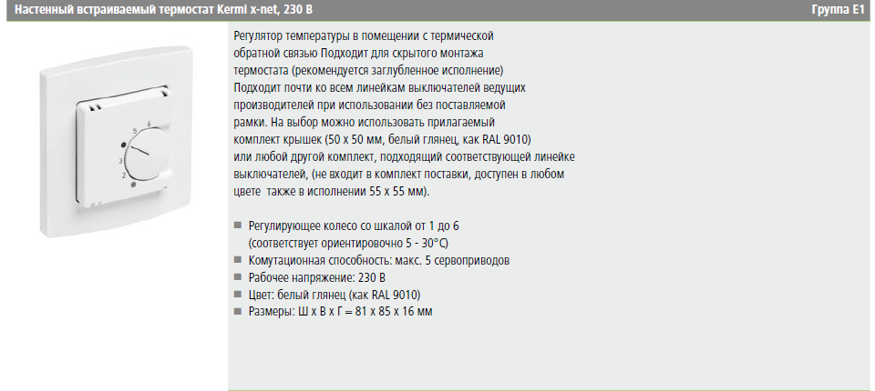 Термостат Kermi x-net имеет квадратный корпус белого цвета, на котором размещено регулирующее колесо со шкалой от 1 до 5, что соответствует температуре 5 - 30 °C (ориентировочно). Комутационная способность устройства: максимум 5 сервоприводов.