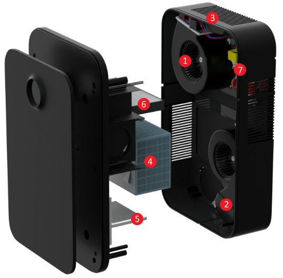 Гигроскопический пластинчатый рекуператор нагревает приточный воздух энергией вытяжного зимой и охлаждает летом. Потребляемая мощность – не более 50 Вт.