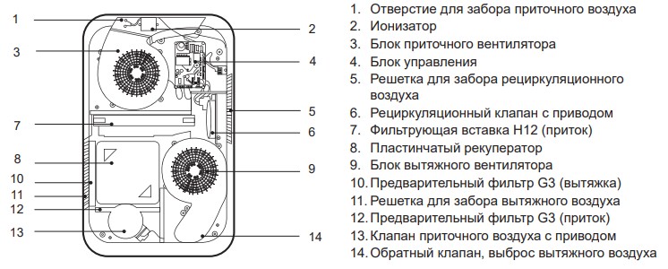 Структура пластин рекуператора позволяет сконденсировавшейся в вытяжных каналах влаге переходить в приточные, увлажняя воздух в зимний период.