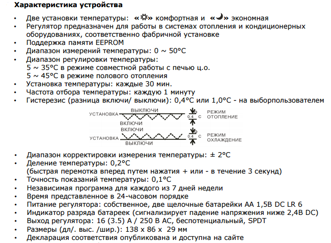 Применяемый в терморегуляторе Euroster 2006 TXRX датчик позволяет считывать температуру с точностью до 0,1ºC и программировать температуру с точностью до 0,2ºC.Контроллер можно запрограммировать в семидневном цикле, с точностью до 0,5 часа, что дает возможность изменения уровня температуры 48 раз в течение суток.Регулятор позволяет запрограммировать разные временные интервалы для каждого дня недели.