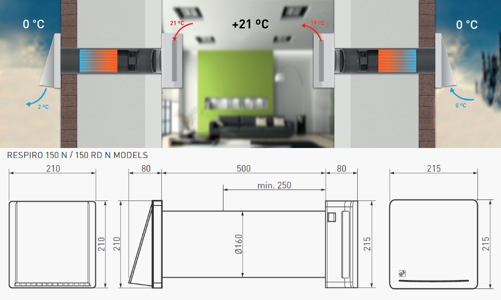 Децентрализованные проветриватели с рекуперацией тепла серии Respiro разработаны специально для вентиляции отдельных бытовых или коммерческих помещений. Конструктивно проветриватель состоит из реверсивного вентилятора с электродвигателем постоянного тока, керамического рекуператора с эффективностью до 93%, наружной и внутренней декоративной панелей. Элегантный дизайн позволяет вписать прибор в любой интерьер. Диаметр внутренней части 160 мм. Минимальная толщина стены для установки 25 см. Проветриватель Respiro предназначен для постоянной работы. Имеет 3 скорости. Управление осуществляется при помощи ду пульта.